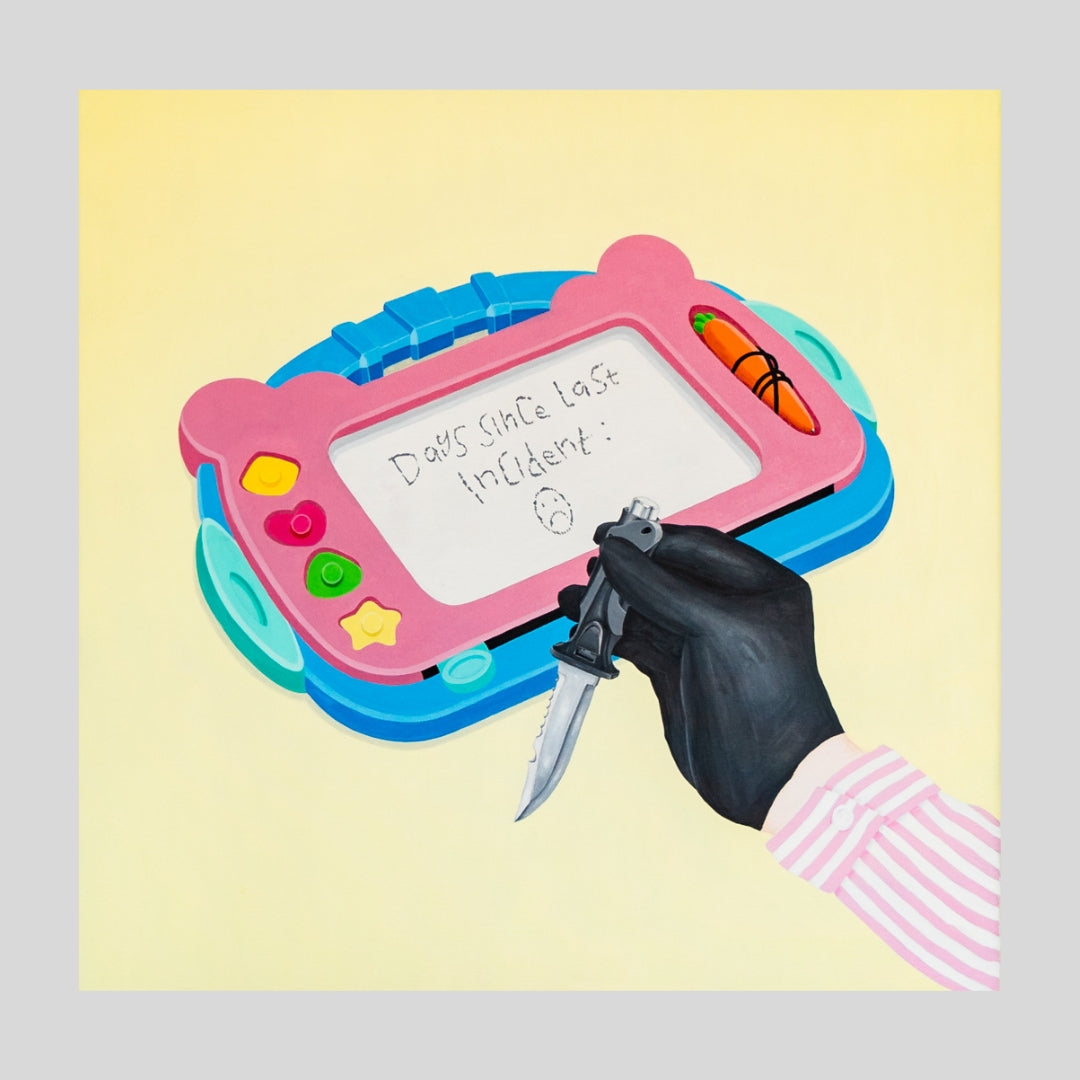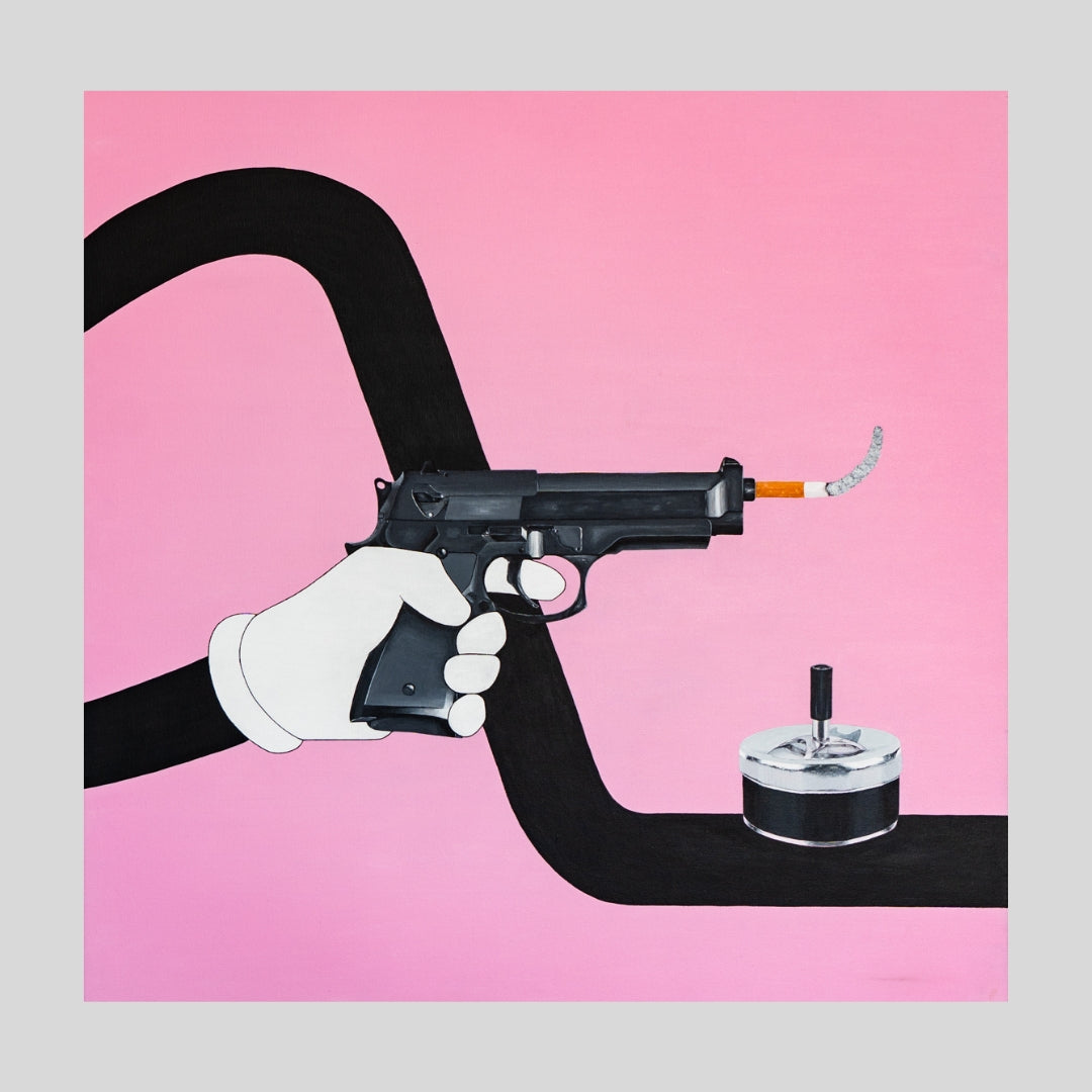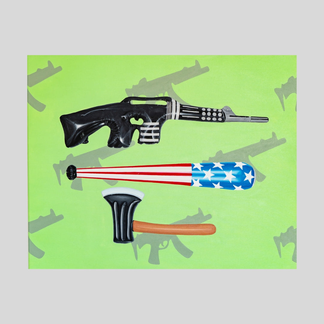 In the universe of these works, hyperreal weaponry appears against lurid playroom imagery, chasing the feverish joy of playing with a new toy - is this menace real, or harmless?”
