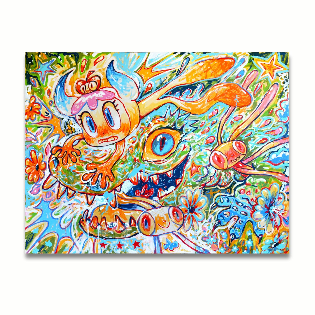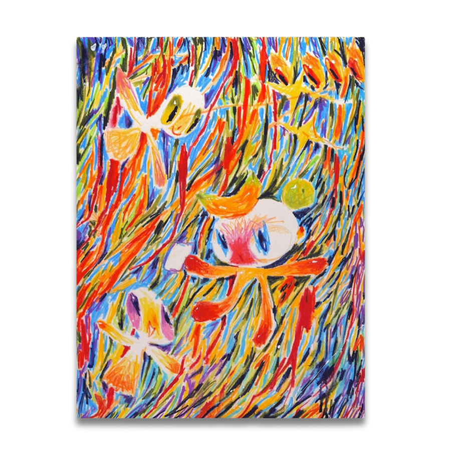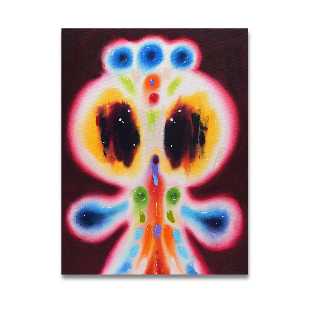 In my work I apply acrylics onto canvas in a free, almost childlike quality, using unrefined shapes alongside more complex rendering methods to develop avatars that encapsulate different modules of my identity. This approach allows me to overlap my younger self's Intuitive energy with my present self's logical thought process, allowing collaboration between these two contradictory and sometimes conflicting identities on the canvas.