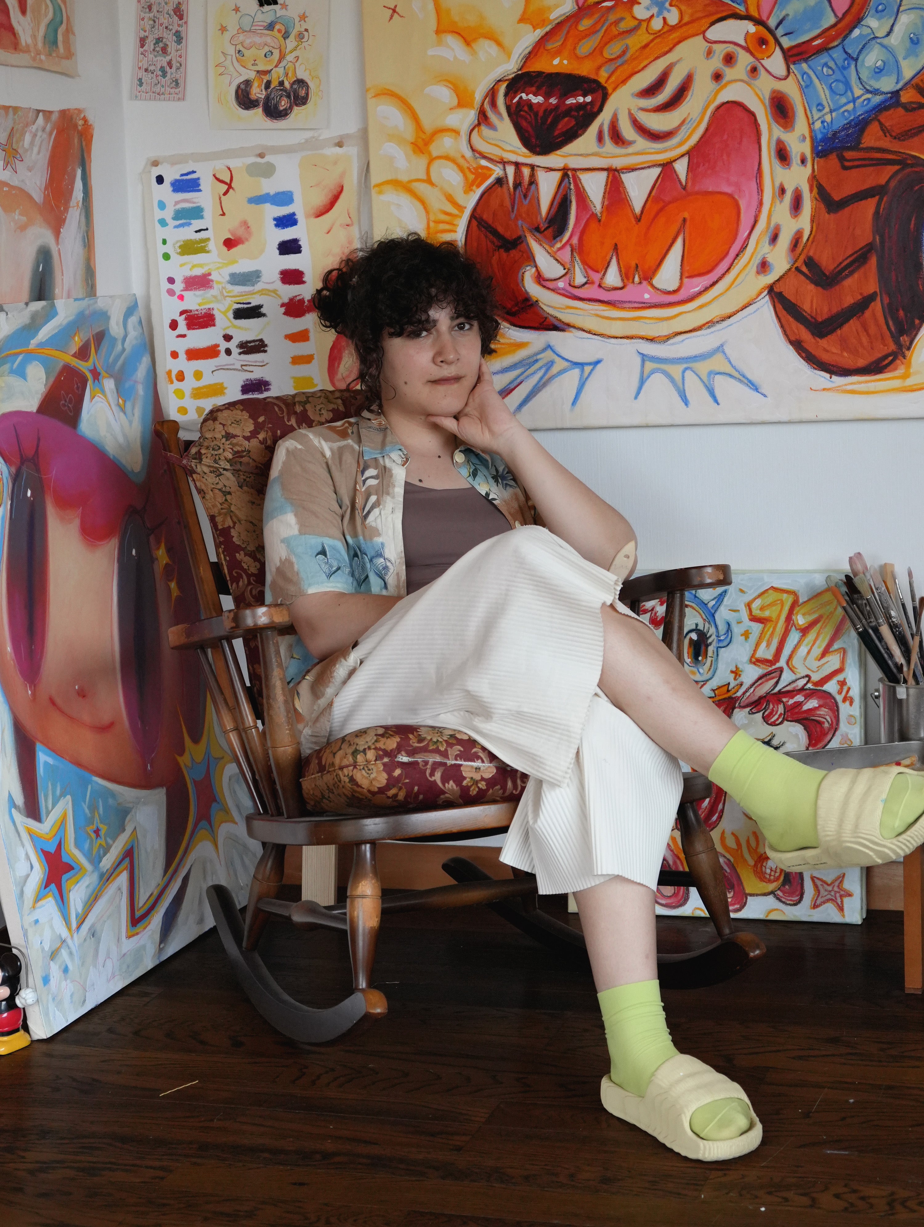 Influenced by her background in animation, comics, Catholic iconography, and her interest in the fast-paced visuals of internet culture, Mila‘s work deals with themes of identity, collective nostalgia, and personal mythologies.